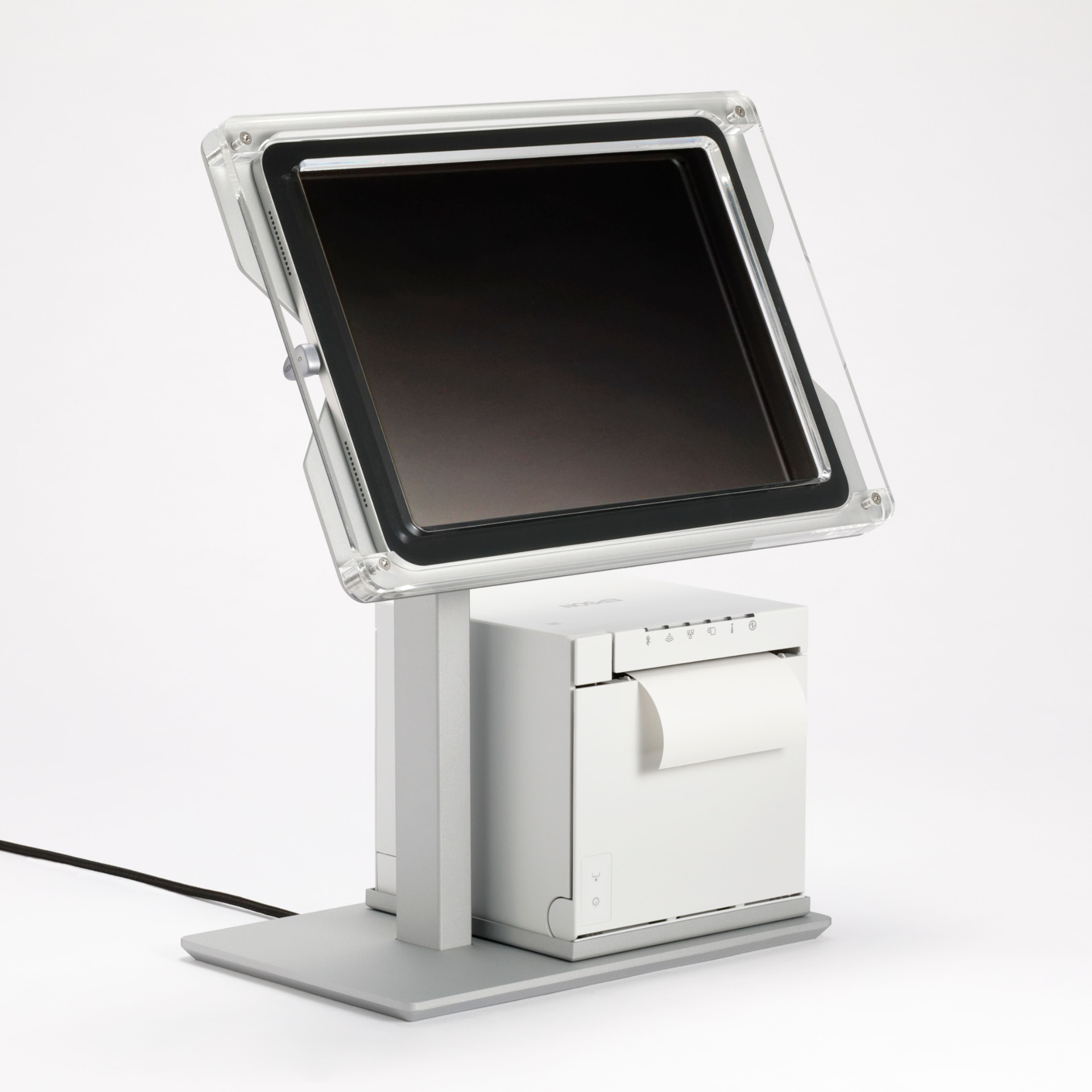 iPadフロアスタンド『T4 Floor』は、発券プリンター用のトレイを標準装備。